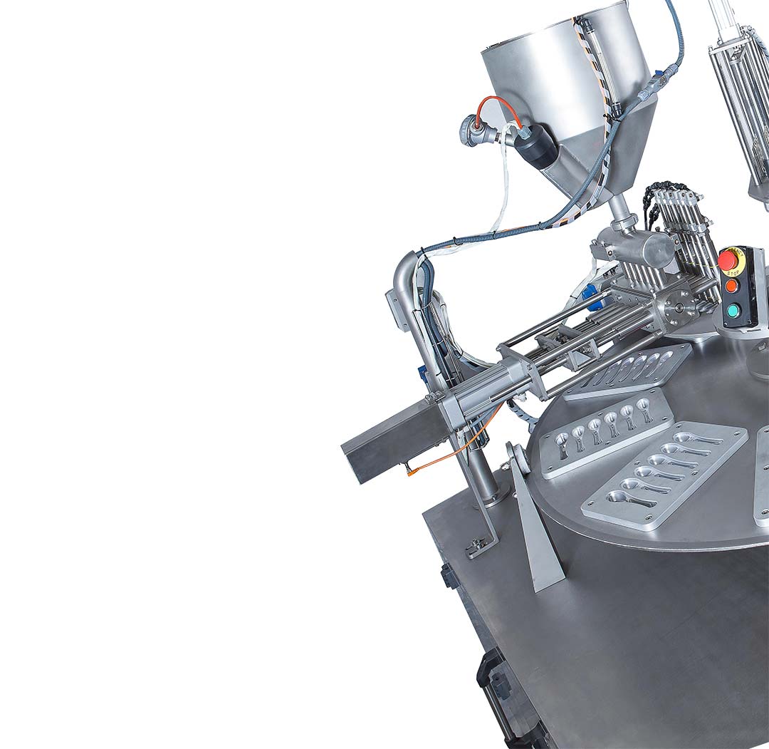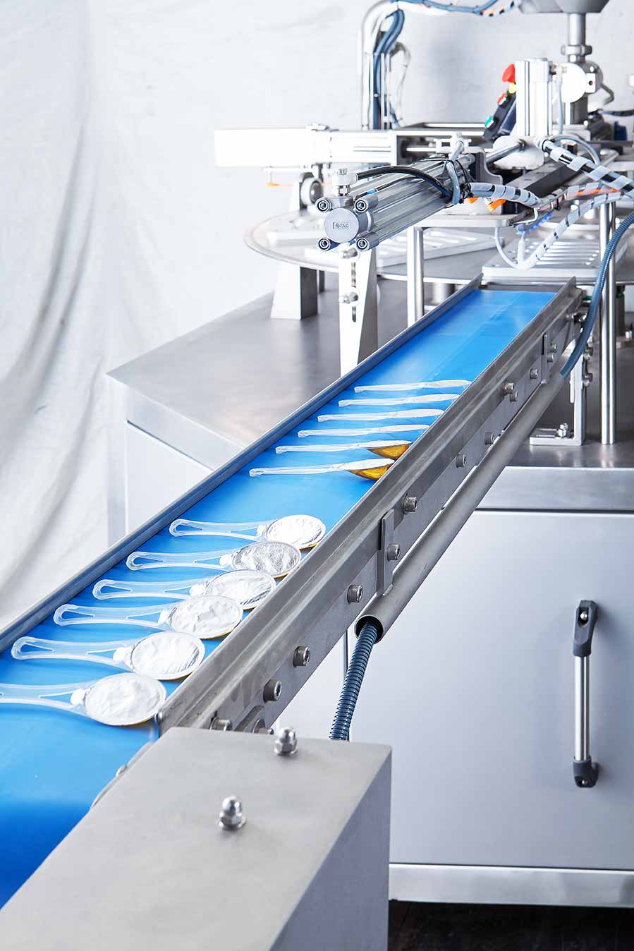 The filling process initiates at the feeding station, where plastic spoons are automatically transported to the filling station. Here, spoons are accurately filled with the desired product, followed by a sealing process with aluminum foil.